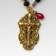 This premium gold-plated black glass rosary comes with high-quality beads and a deluxe Holy Mass Crucifix and gold-plated Sacred Heart center...