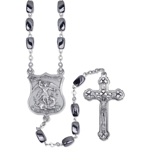 This striking rosary is crafted with 4.5mm faceted oval hematite beads, paired with an antiqued silver-plated crucifix and a Saint Michael centerpi...