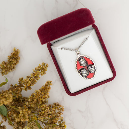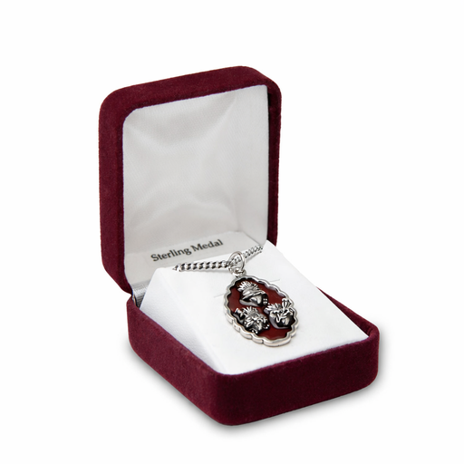 This beautifully crafted Three Hearts devotional medal is made of sterling silver with rich red enamel detailing. The design features the Sacred He...