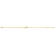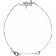 A stunning blend of faith and elegance, this 14K yellow gold double sideways cross bracelet is adorned with natural round diamonds (1/5 CTW) for a timeless sparkle. Designed with a polished finish and secure prong settings, this bracelet is both meaningful and stylish.