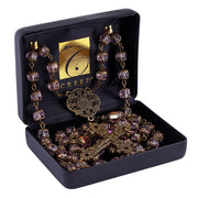 This beautiful rosary honors the Sacred Heart of Jesus and the Immaculate Heart of Mary, powerful symbols of divine love, mercy, and devotion. A finely detailed filigree centerpiece depicts the entwined hearts, crowned to signify their united reign over the faithful.