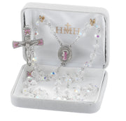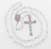 The New England Crystal Pewter Rosary is a stunning devotional rosary featuring 6mm faceted clear crystal beads. Exclusive designed center and crucifix lead free New England Pewter and accented with delicate pink enamel.