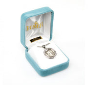 - Round shaped double sided medal with pink cubic zirconias "CZ's"